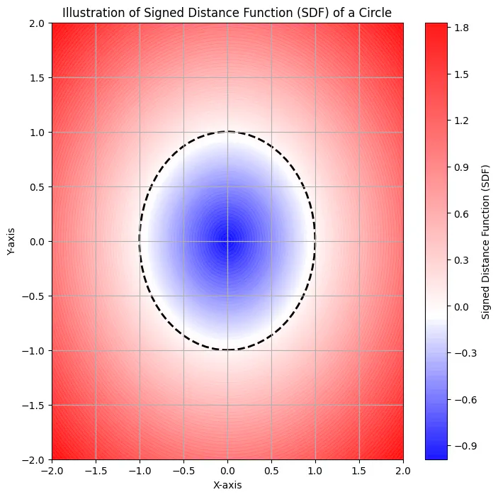 Positive Values: Points with positive SDF values are located outside the shape. Similar to negative values, the magnitude indicates the distance from the point to the nearest surface outside the shape.